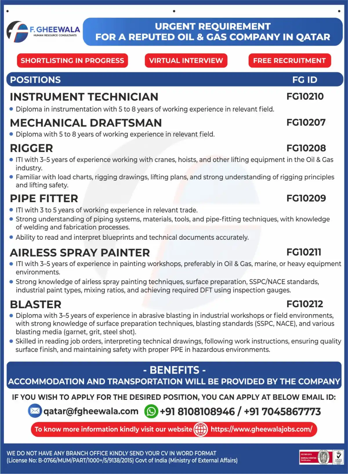 F. GHEEWALA HR Consultants urgently hiring for Instrument Technician, Mechanical Draughtsman, Rigger, Pipe Fitter, Airless Spray Painter & Blaster positions in Qatar. Company-provided accommodation & transport. Free recruitment.