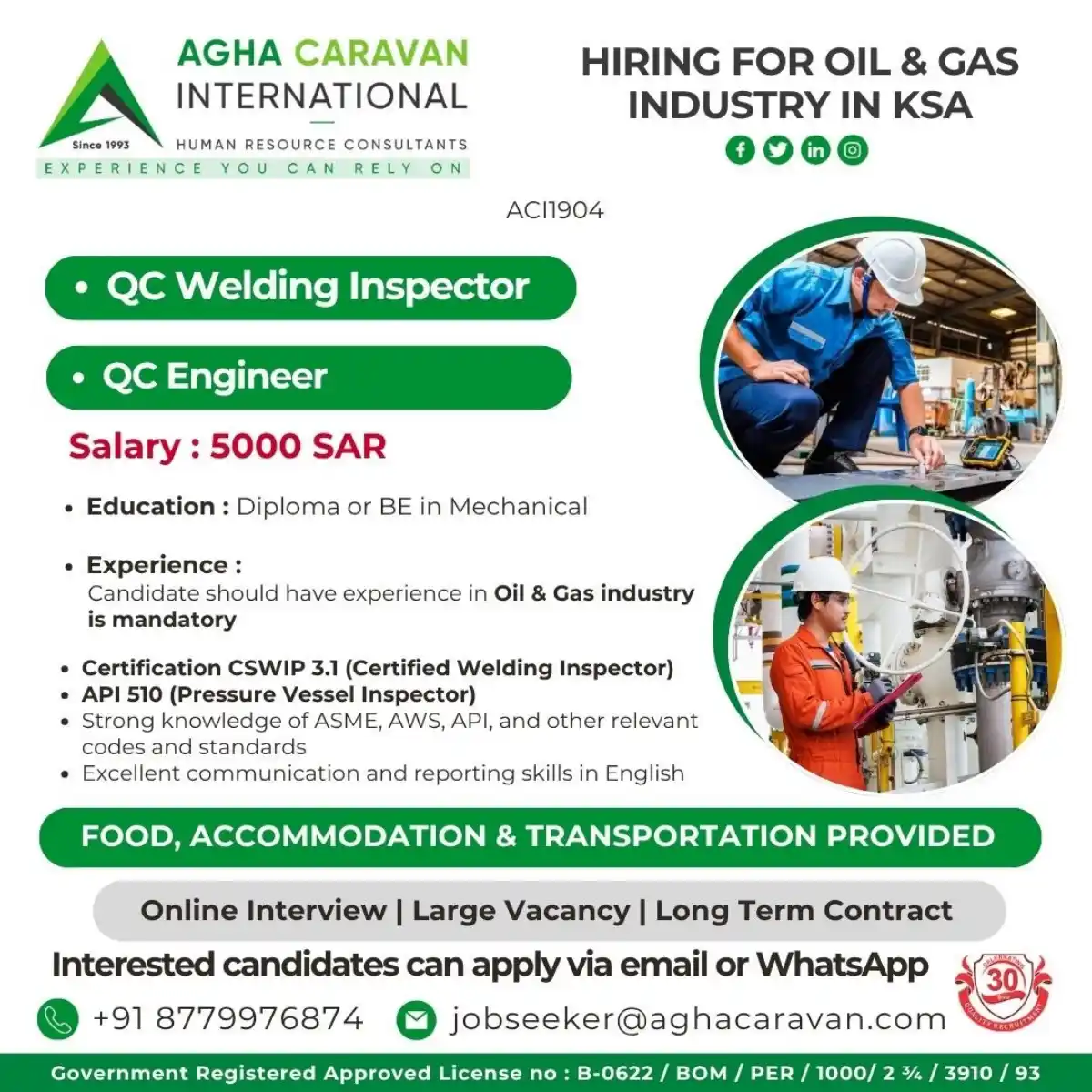 Hiring QC Welding Inspector in KSA Oil & Gas. Salary 5000 SAR, benefits provided. Apply now via email or WhatsApp.