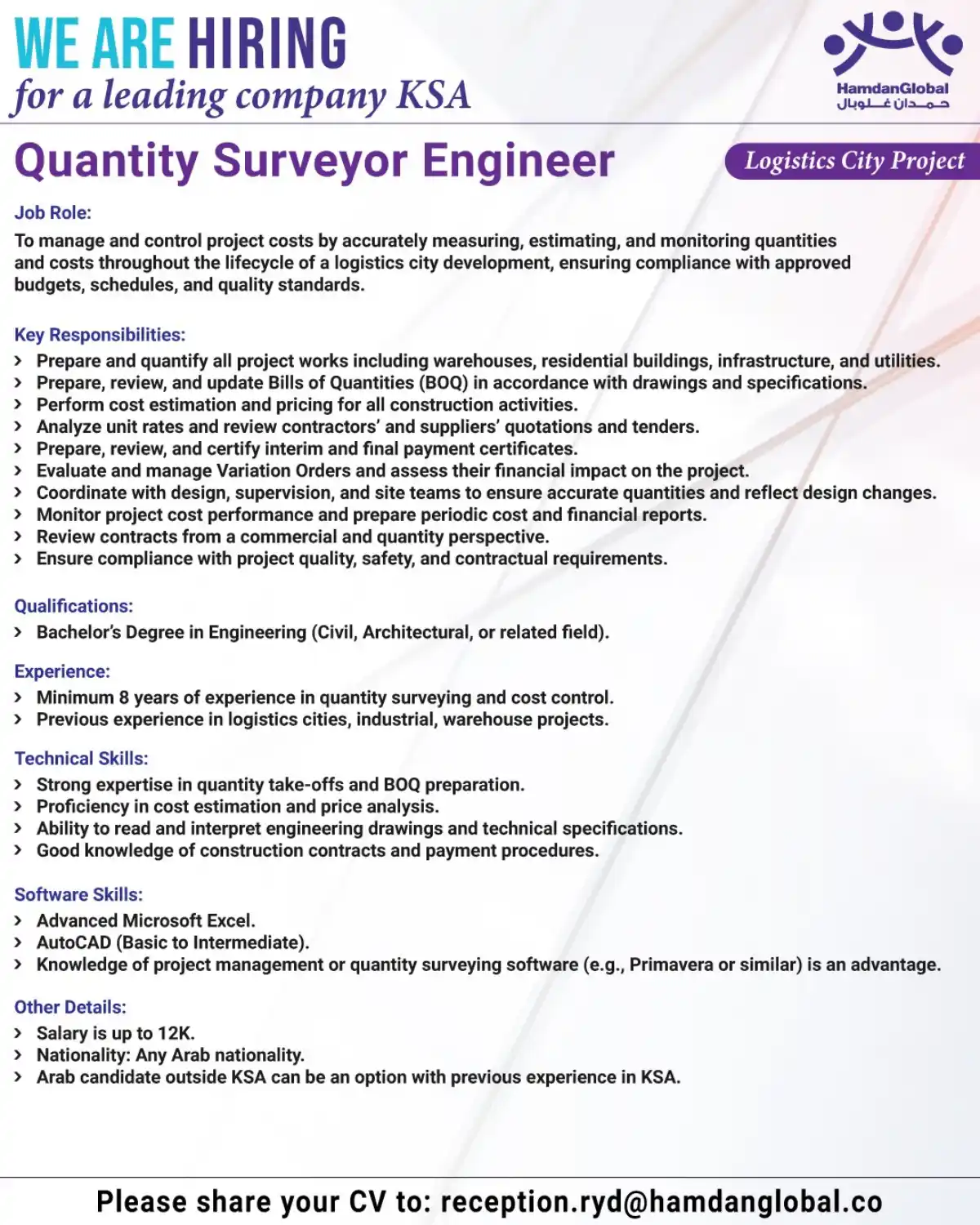 HamdanGlobal seeks experienced Quantity Surveyor Engineer for Logistics City Project in Saudi Arabia. 8+ years experience required. Competitive salary. Apply now.