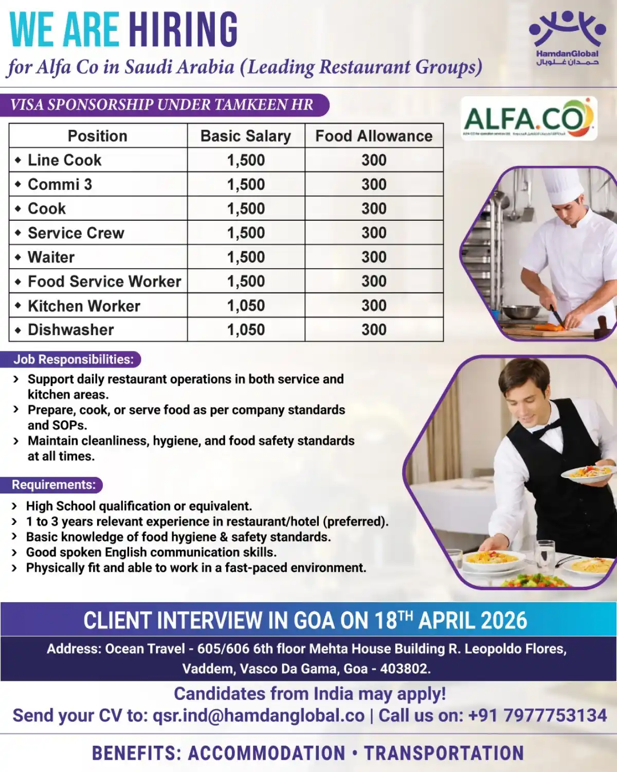 Alfa Co is hiring for multiple restaurant positions in Saudi Arabia with visa sponsorship, free accommodation, and transportation. Basic salary 1,500 SAR + 300 SAR food allowance. Interview in Goa on 18th April 2026.