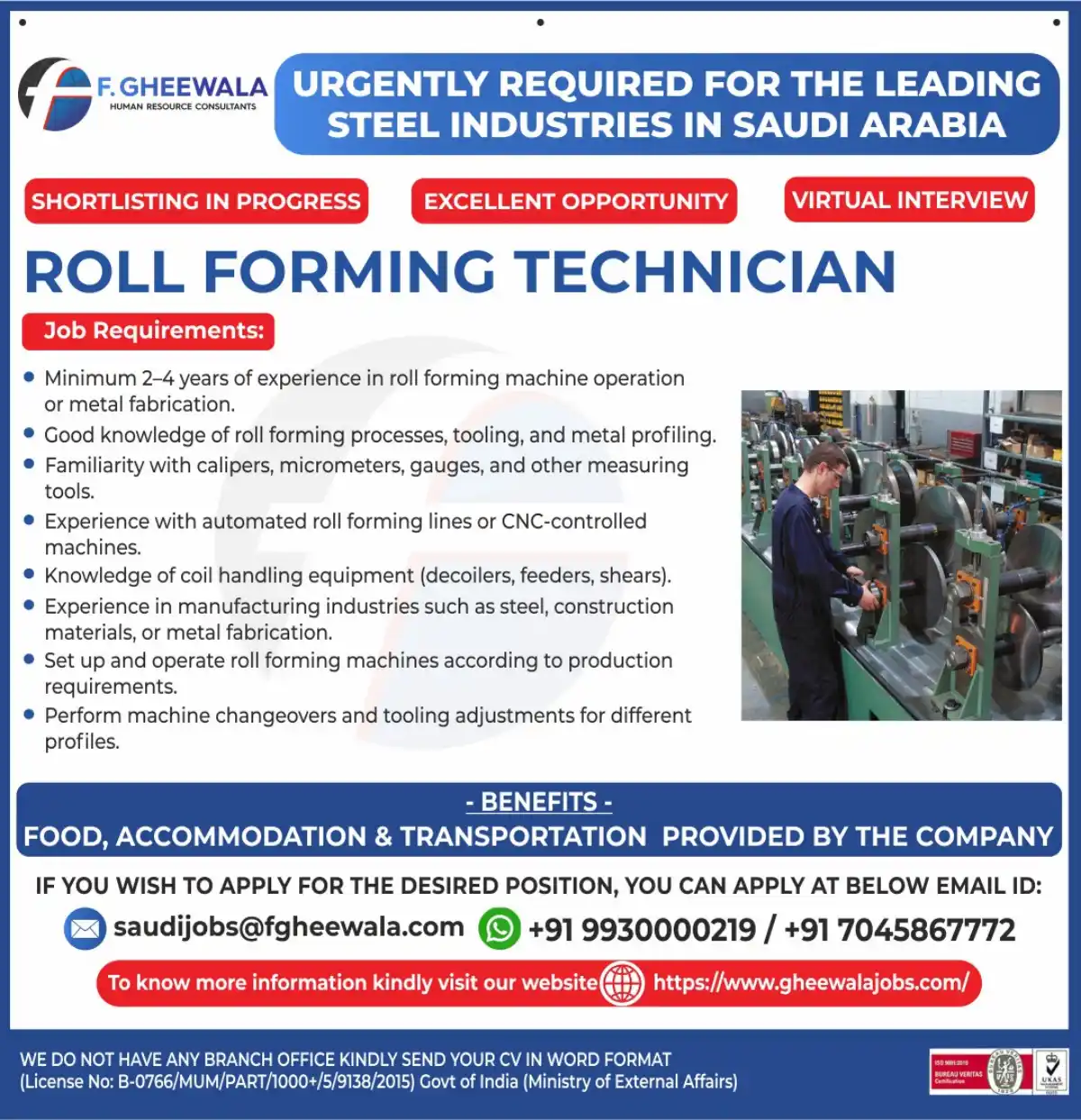 Excellent opportunity for Roll Forming Technician in Saudi Arabia with company-provided benefits. Virtual interviews in progress.