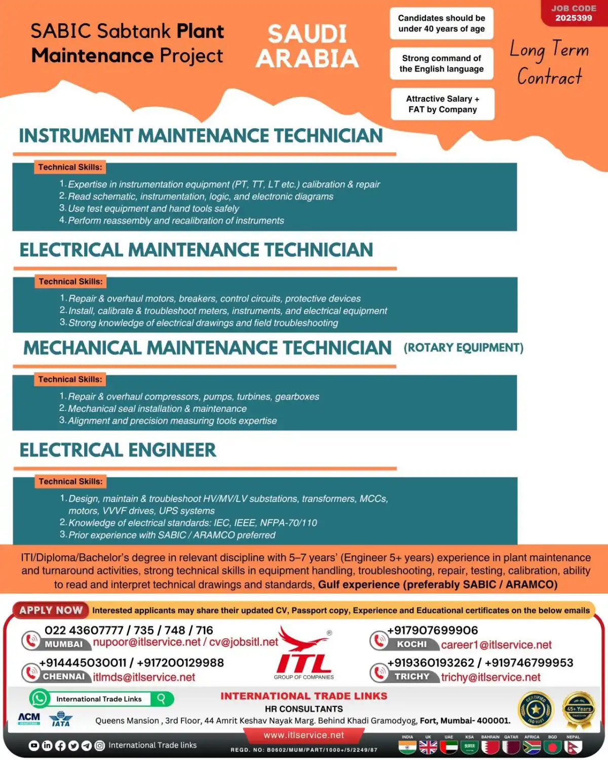 Openings for maintenance technicians and engineers at SABIC Sabtank Plant in Saudi Arabia. Long-term contract with competitive salary. Gulf experience preferred.