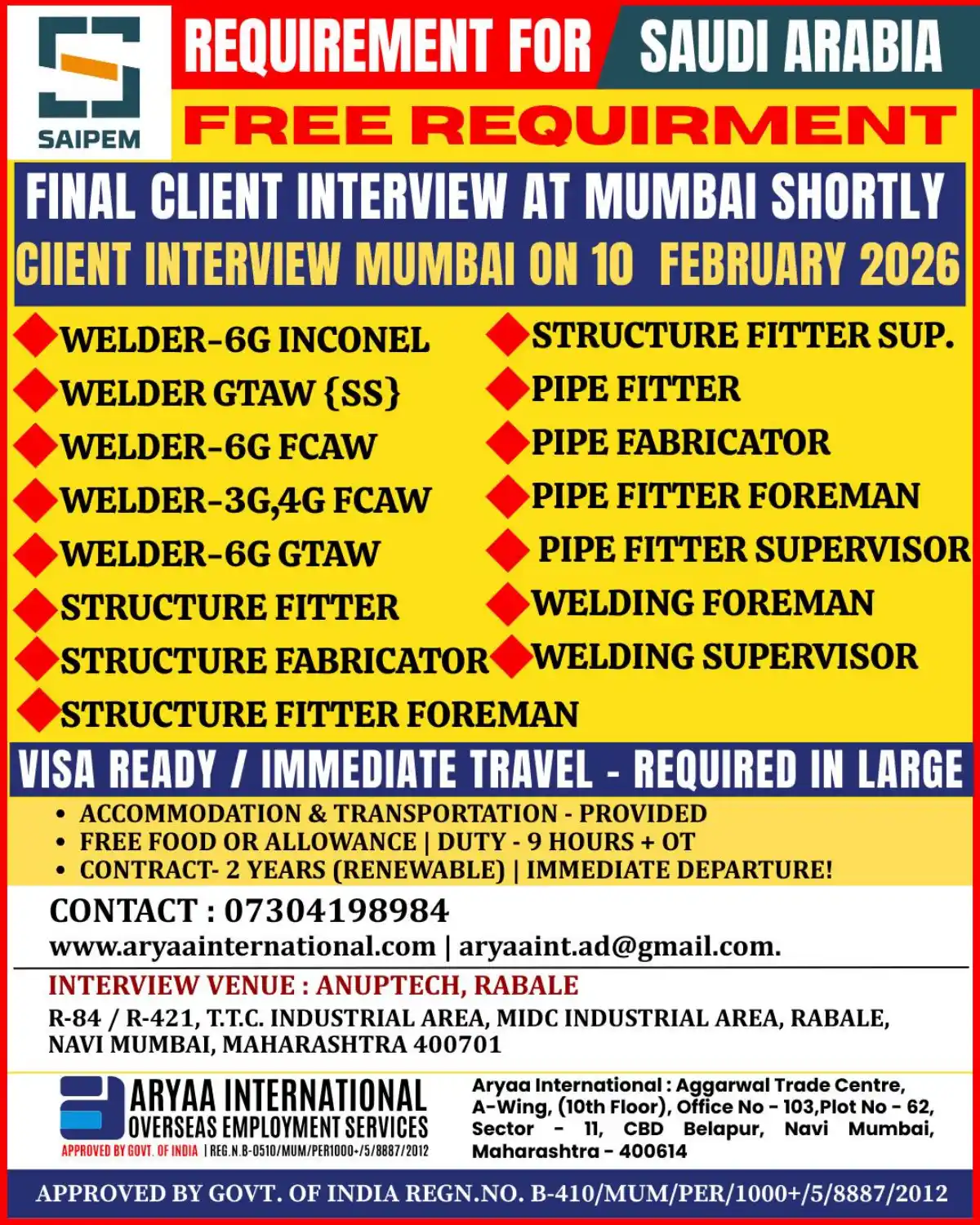 Apply for welder and fitter jobs with Saipem in Saudi Arabia. Free benefits and immediate departure. Interview in Mumbai.