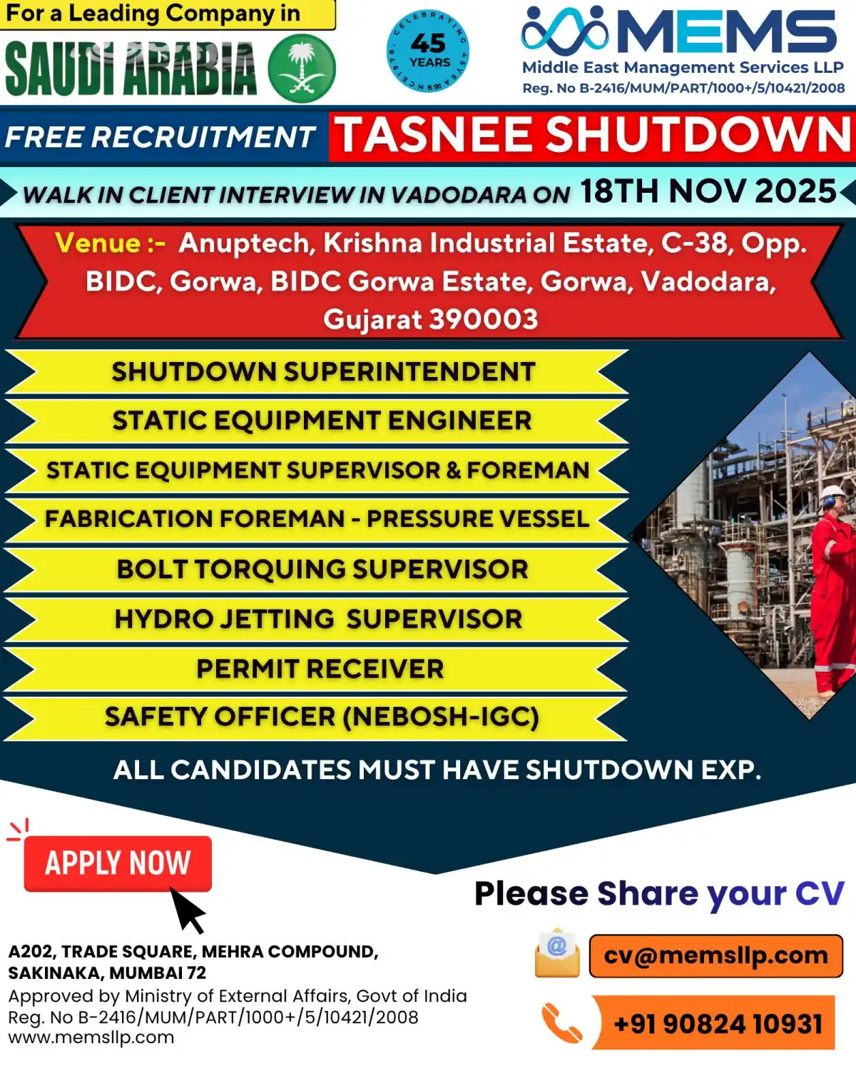 Hiring for shutdown positions in Saudi Arabia. Walk-in interview on 18th Nov 2025. Roles include Superintendent, Engineer, and Supervisor.