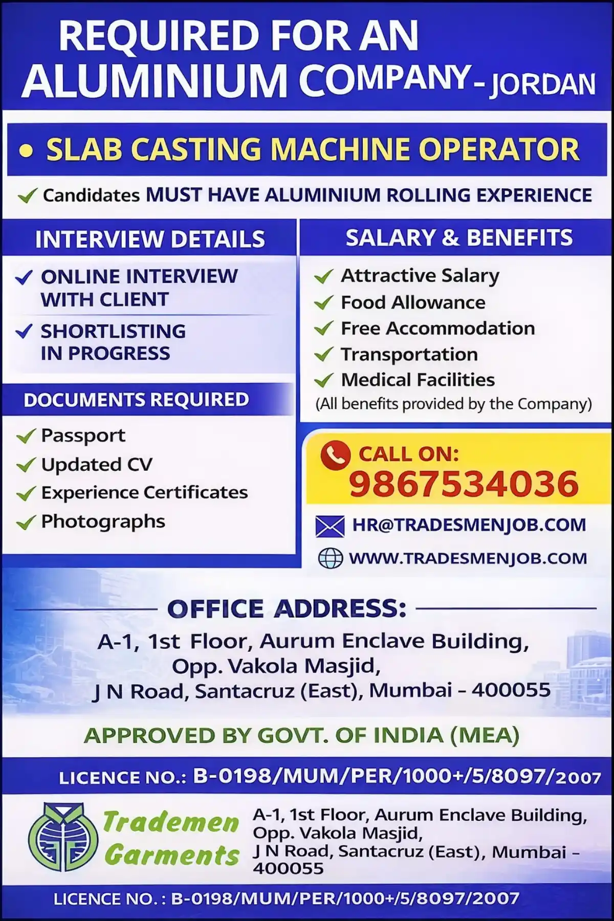 Urgent hiring for an Aluminium Company in Jordan. Must have aluminium rolling experience. Online interviews. Attractive salary with free accommodation and medical benefits.