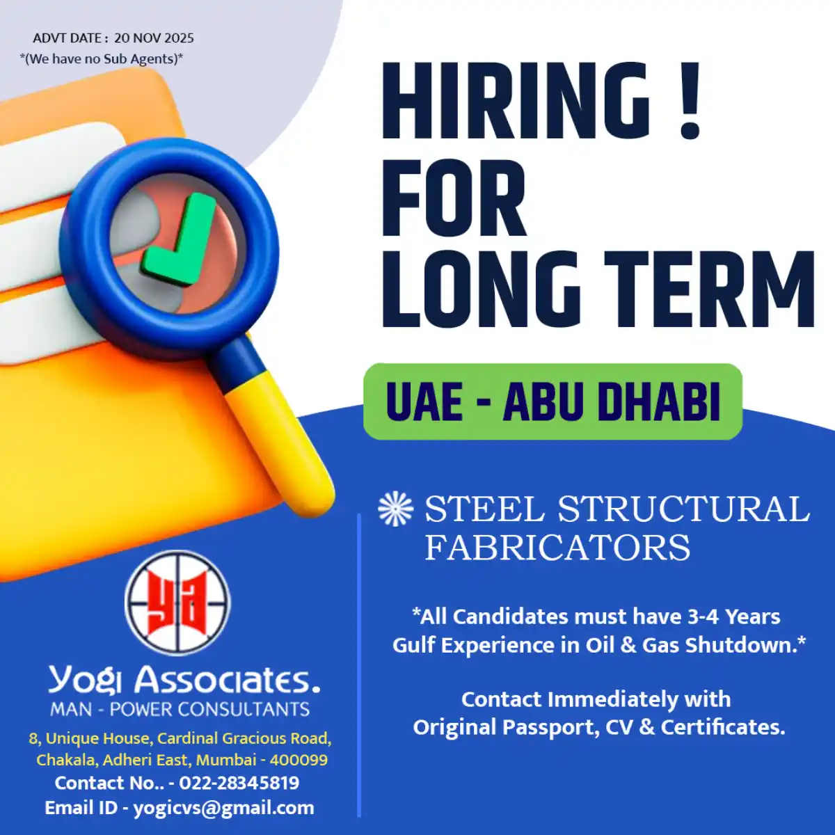 Hiring experienced Steel Structural Fabricators for long-term roles in Abu Dhabi. Gulf experience in Oil & Gas Shutdown required. Apply now.