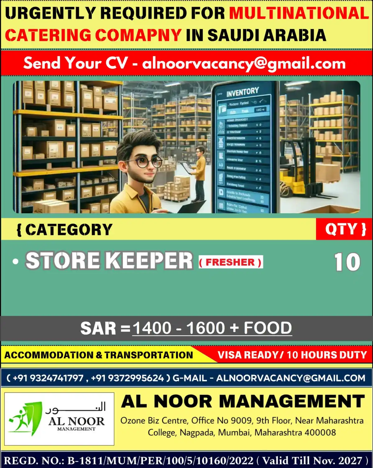 Urgent hiring for Store Keeper freshers in Saudi Arabia with salary SAR 1400-1600 and full benefits including visa, food, and accommodation.