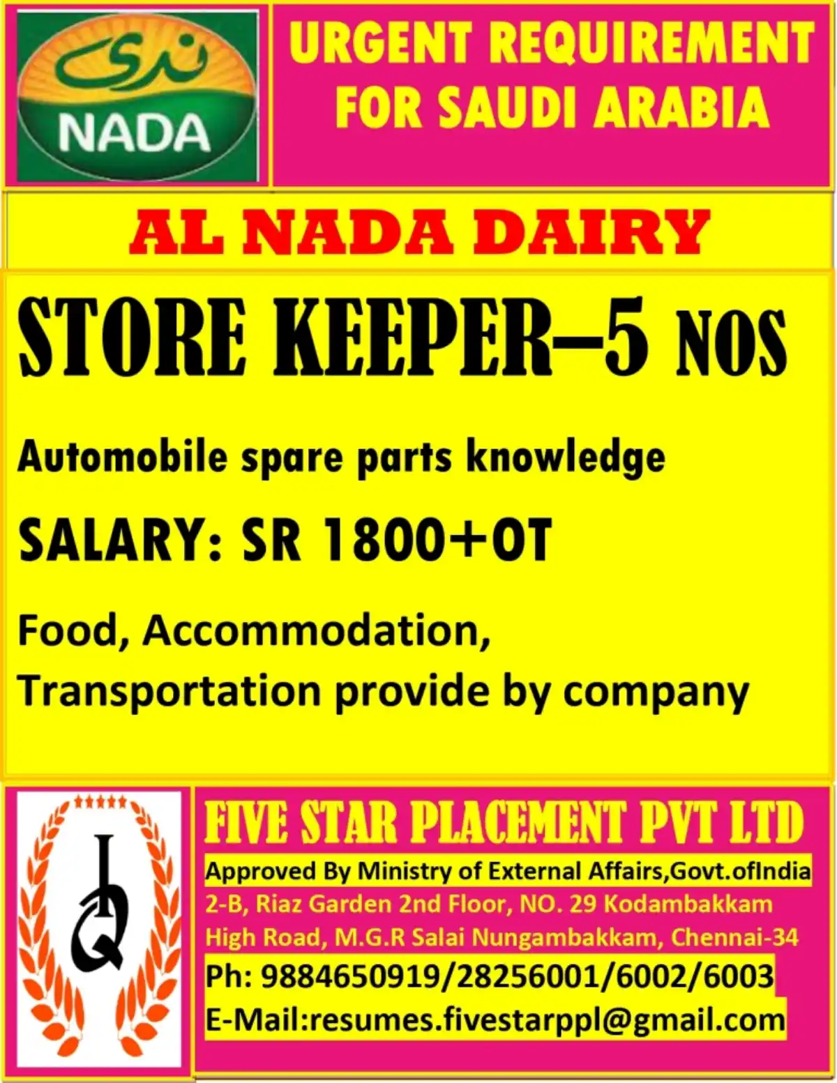 Urgent openings for Store Keepers in Saudi Arabia. Salary SR 1800+OT, benefits included. Apply now!