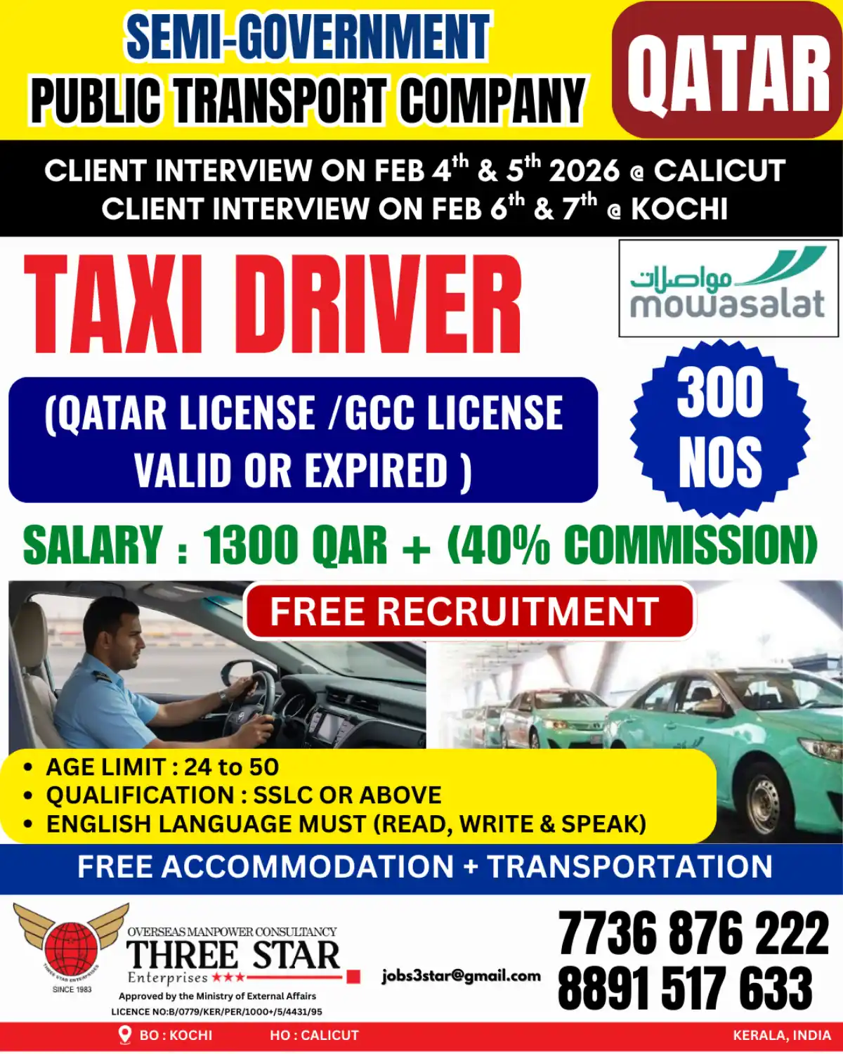 Mowasalat Qatar is hiring 300 Taxi Drivers. Earn 1300 QAR + 40% Commission. Free Accommodation & Transport. Qatar/GCC License holders (valid/expired) can apply. Client Interviews in Kerala in Feb 2026.