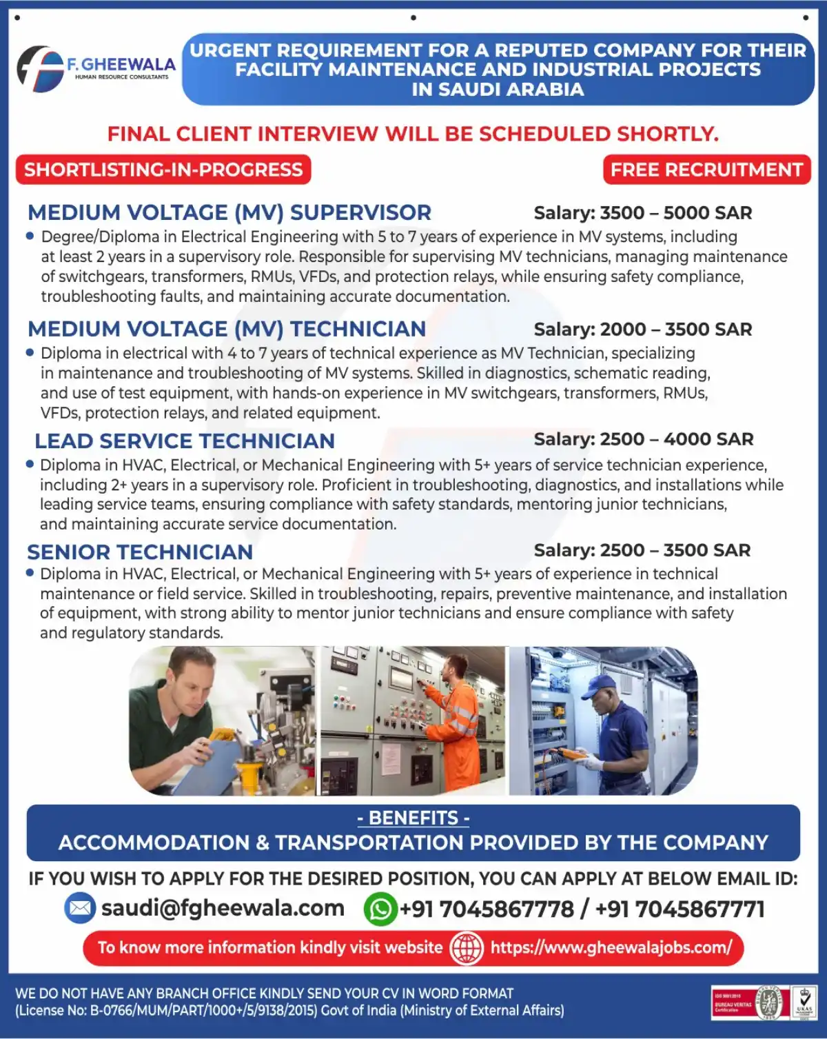 Apply for MV and service technician roles in Saudi Arabia with free recruitment, accommodation, and transportation. Interviews scheduled shortly.