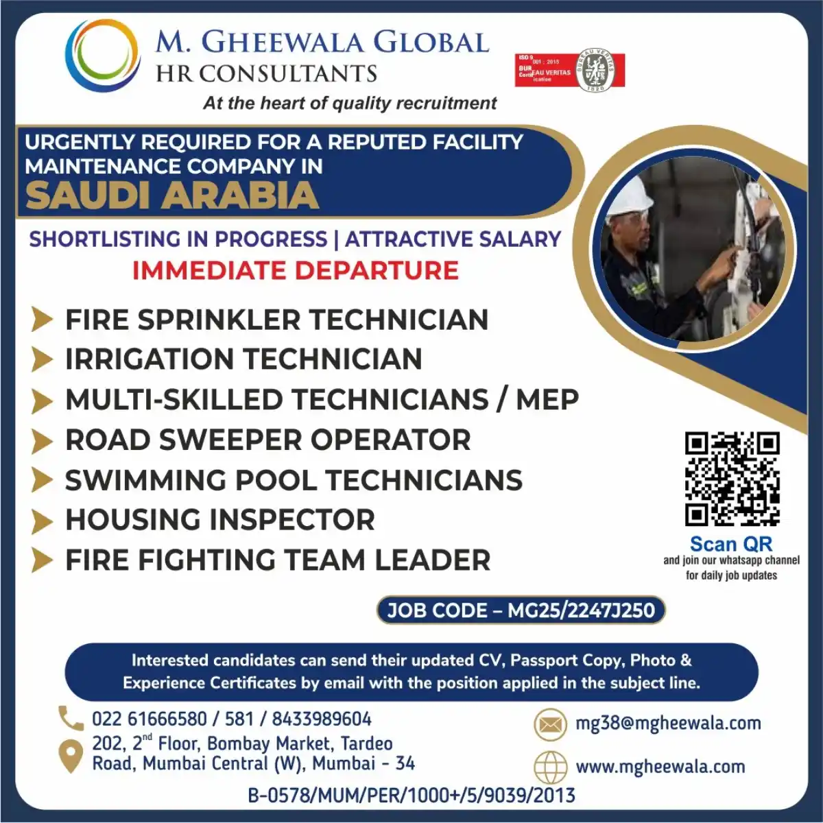 Apply for multiple technician roles in facility maintenance company in Saudi Arabia. Immediate departure and attractive salary.