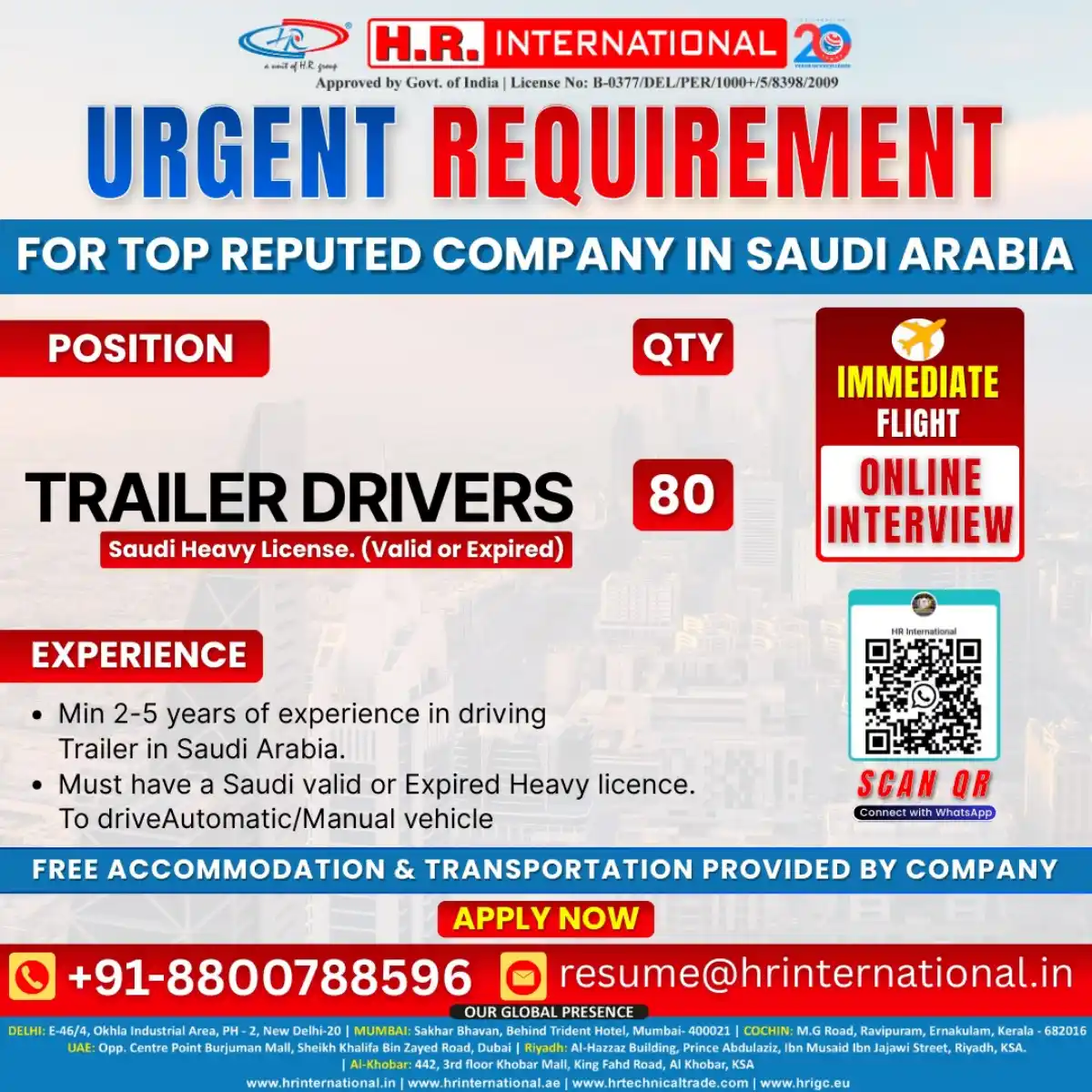 Urgent requirement for 80 Trailer Drivers in Saudi Arabia. Minimum 2-5 years experience and Saudi heavy license required. Free accommodation and transport. Immediate interview.