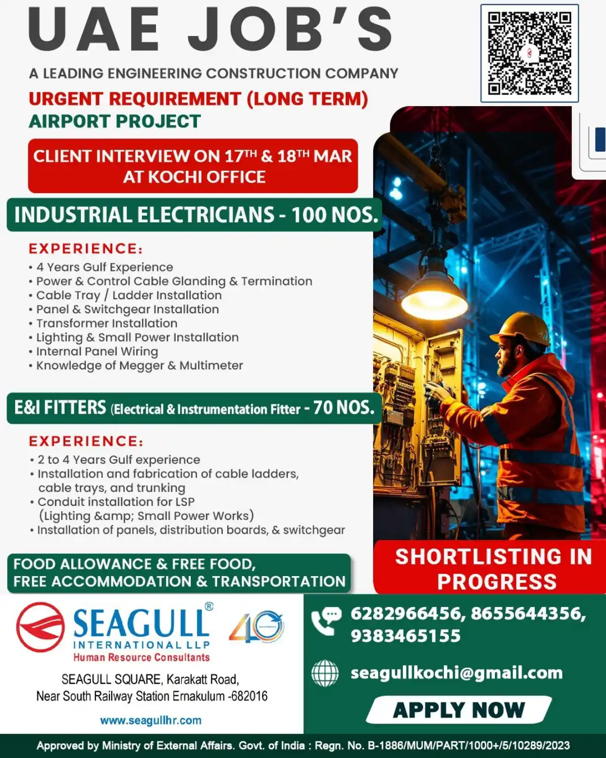 Leading construction company urgently hiring 100 Industrial Electricians and 70 E&I Fitters for UAE airport project. Requirements: 2-4 years Gulf experience. Benefits: Free food, accommodation, transport. Kochi interviews March 17-18.