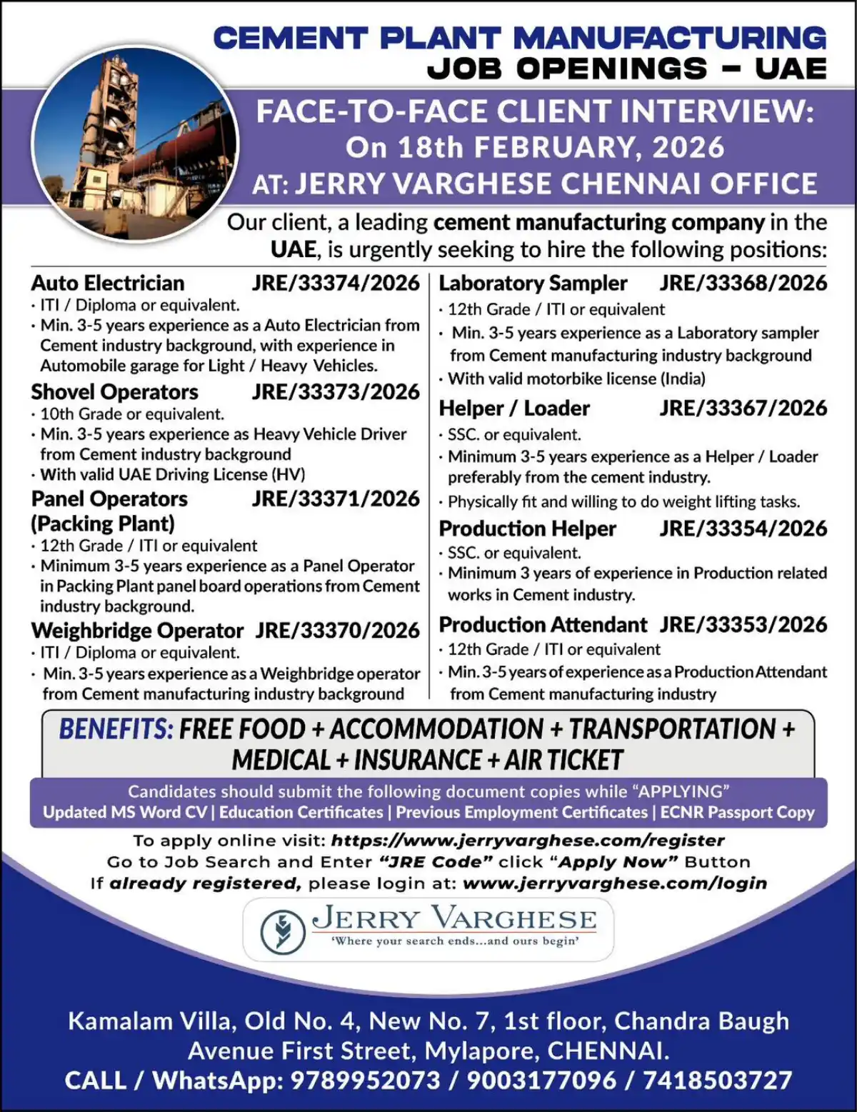 Multiple cement plant job openings in UAE for experienced professionals. Positions include Auto Electrician, Panel Operators, Shovel Operators & more. Face-to-face interview in Chennai on 18th February 2026. Free accommodation, food, medical & air ticket provided.
