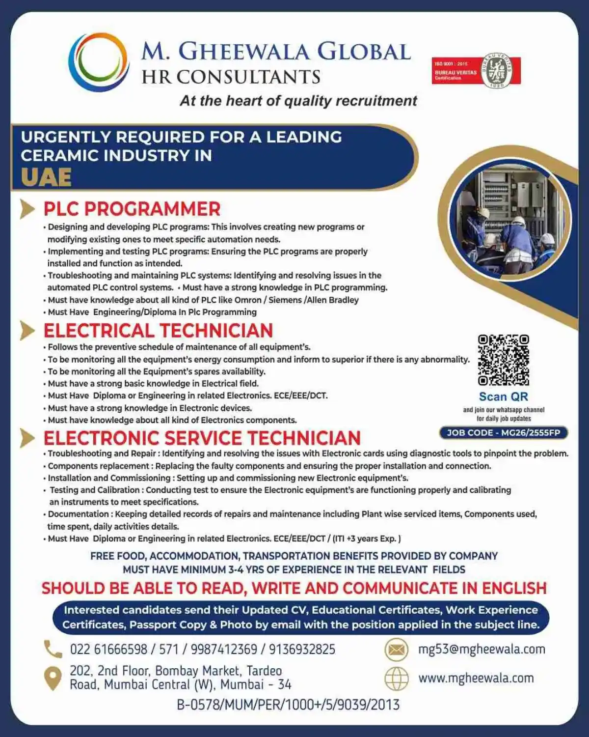Multiple technical positions available in leading UAE ceramic industry with excellent benefits including free accommodation, food, and transportation. Urgent hiring for qualified candidates.