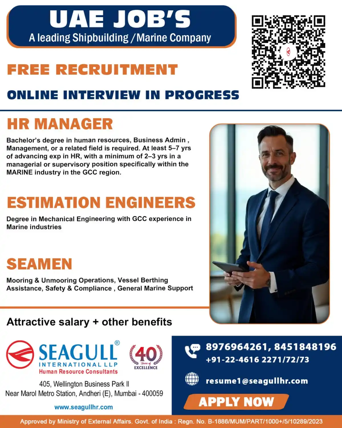 Immediate openings in UAE for HR Manager, Estimation Engineers, and Seamen. Free recruitment and online interviews. Apply today!