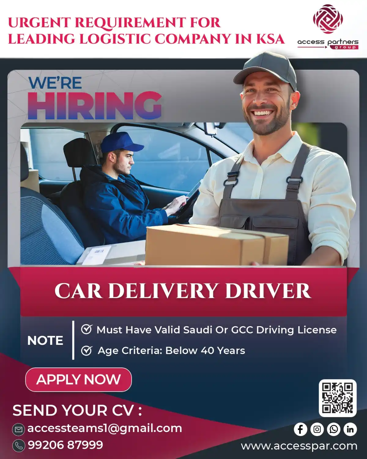 Leading logistics company Access Partners Group urgently hiring Car Delivery Drivers in Saudi Arabia. Requirements: Valid Saudi/GCC license, below 40 years. Apply now by sending CV to accessteams1@gmail.com or call 9920687999.