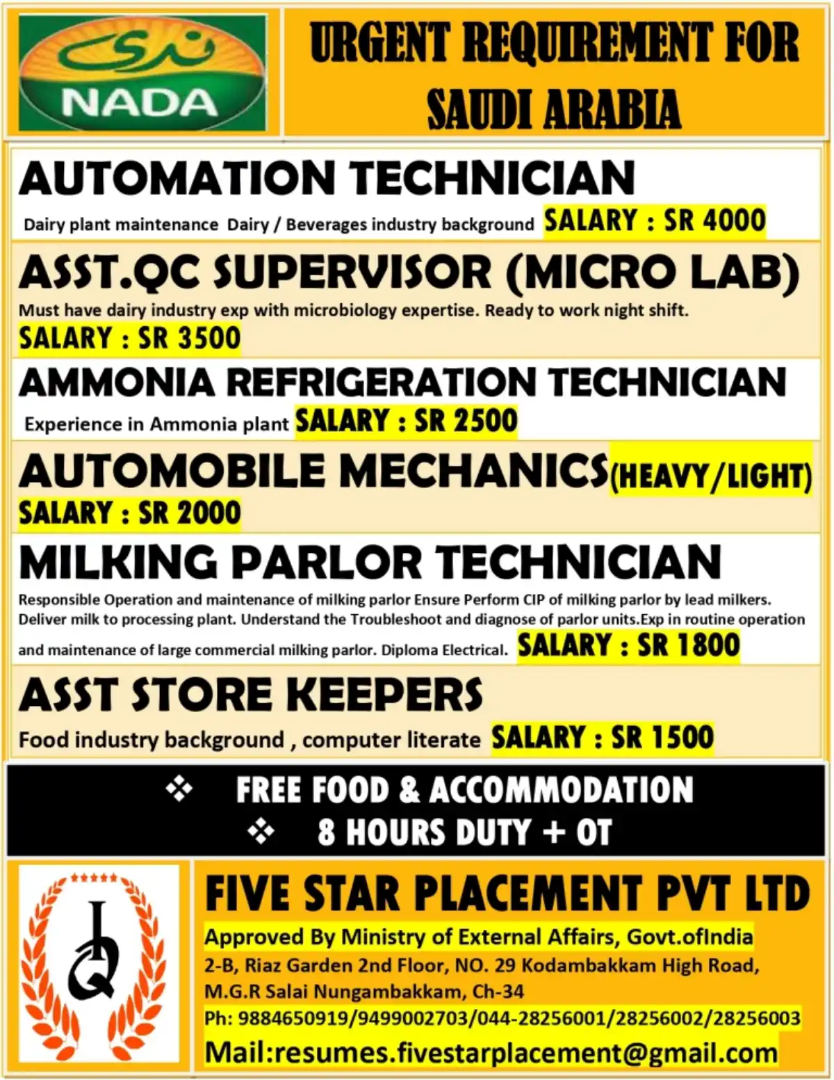 Multiple positions available in Saudi Arabia for dairy industry professionals with attractive salaries and benefits including free food and accommodation.