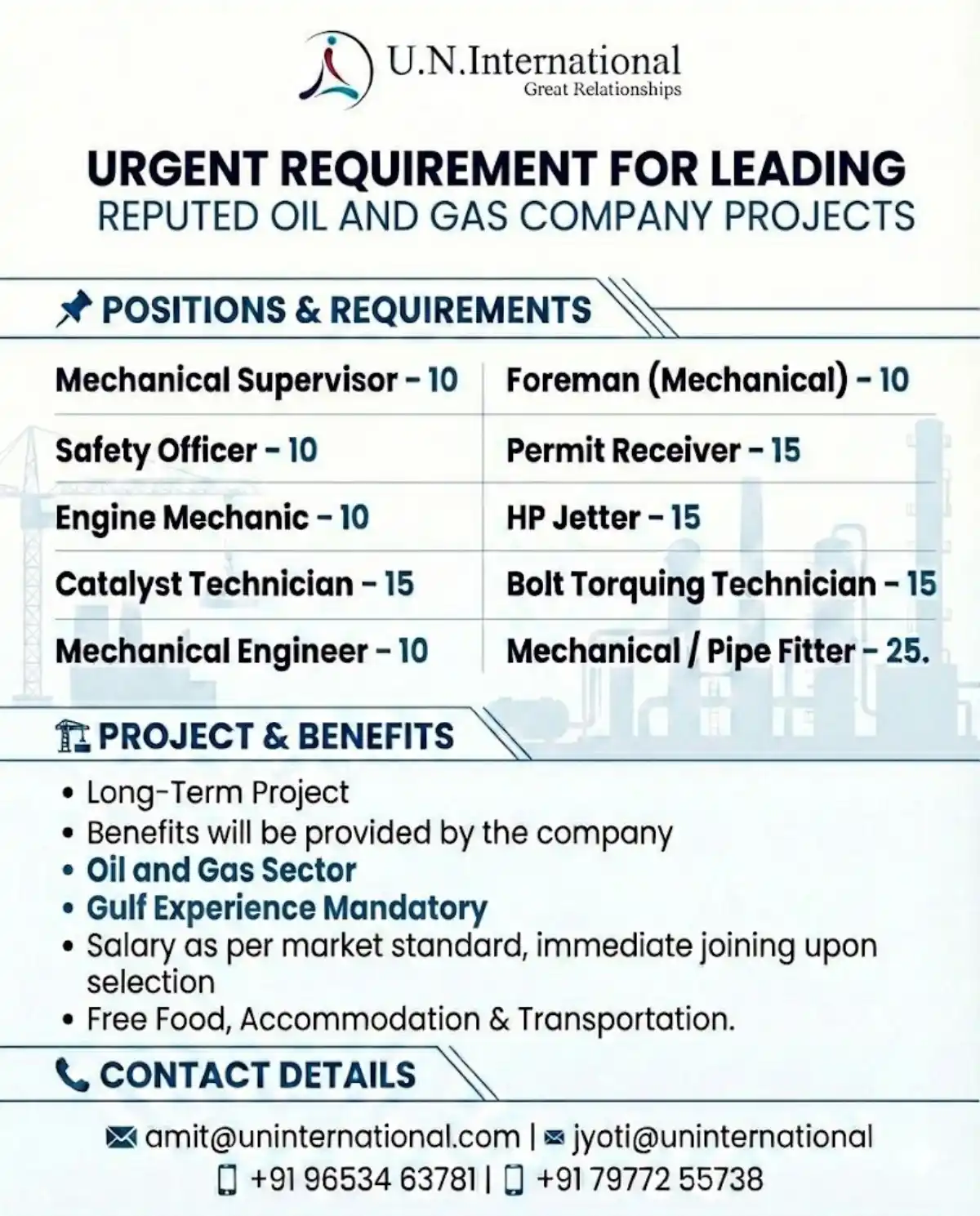 Immediate job openings for a leading Oil & Gas company. Multiple positions available with free food, accommodation, and transport. Gulf experience required.