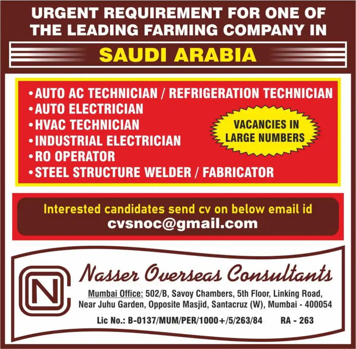 Apply for various technical roles in Saudi Arabia’s farming sector. Send your CV to cvsnoc@gmail.com for immediate consideration.