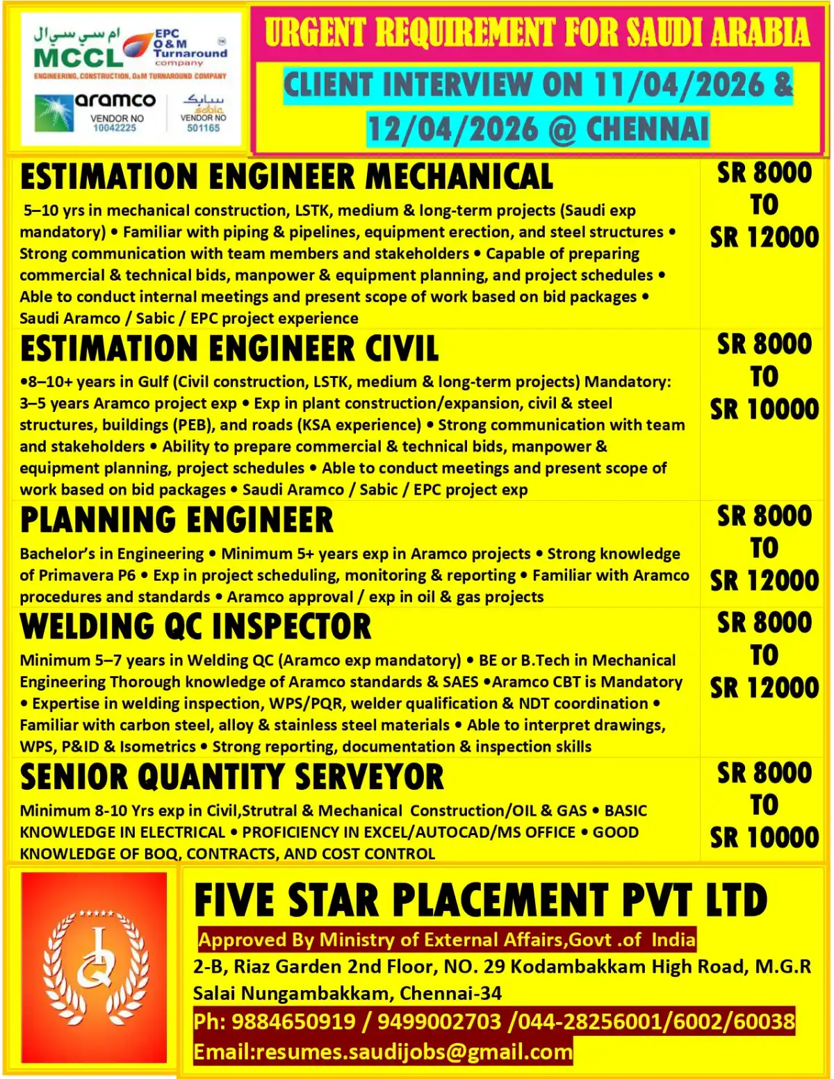Hiring for Saudi Aramco/SABIC projects: Estimation Engineers (Mech/Civil), Planning Engineer, Welding QC & QS. Interview in Chennai on 11-12 April 2026. MEA-approved recruitment.