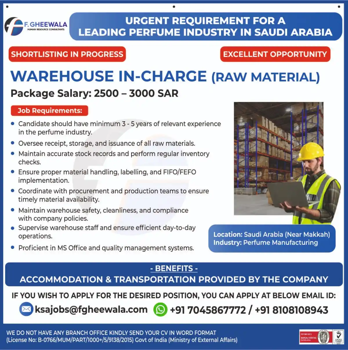 Manage warehouse operations in Saudi Arabia’s perfume industry. Salary 2500-3000 SAR with accommodation and transport provided. 3-5 years experience required.